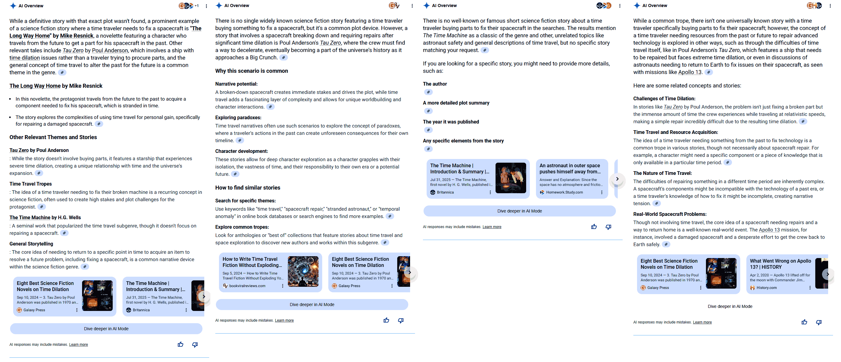 Something unexpected happened in response to one of my earliest queries, however, while I was using the search text sf story time traveller [sic] buying to fix his spacecraft. Here’s a cropped version of a screencap of the results page showing the interesting bit, the AI Overview that Google is cramming down search users’ throats nowadays: